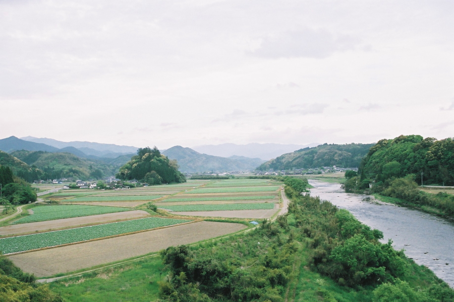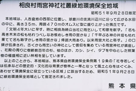 | ▼「雨宮神社の森」(向かって左)とダム建設で揺れる「川辺川」 | ||
