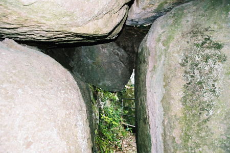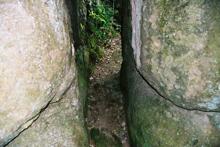 | ▼「三産くぐり」(南より上部を望む) | ▼「三産くぐり」(南より下部を望む) 「イルガガ(雨を我にと祈る)」の「シュメールくさび型文字」 があるとされています。 ※ 「ペトログラフ通信」 第32号より |