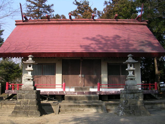 | 「鼻毛石八幡神社」社殿 (北緯36度26分36秒・東経139度10分19秒(誤差含む)) ▼(南西より望む) |