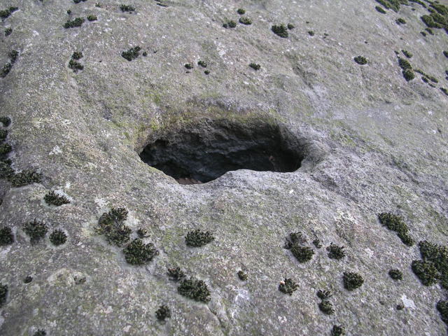 | 鼻毛石八幡神社・「硯石」の「盃状穴」 ▼(北北東より望む) |