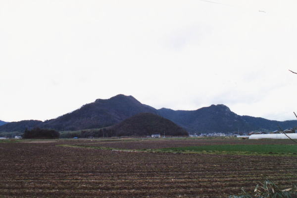 | 舟岡山(152M)山麓より紅かす山(175M)(中央手前) 及び箕作山(背後)を望む |
