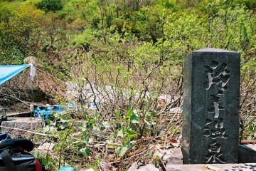 ▼「かもしか温泉跡」の浴槽跡(左)と石碑(右)