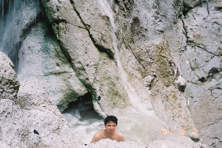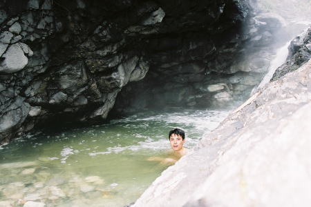 川原毛大湯滝 ▼「川原毛大湯滝」上部の滝壺に入湯(2001年) |