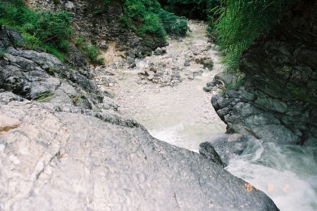 | ▼「川原毛米つき滝」上部の半洞窟風呂に入湯(2001年) | ▼「川原毛米つき滝」上部より滝壷を覗く(2001年) | |