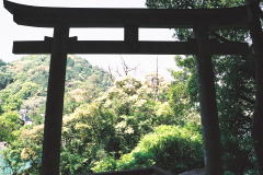 | ▼「河内神社」遥拝所? | ▼鳥居より清暑島(河内神社)を望む | |
