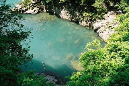 | ▼清暑島(河内神社)下の「古座川」の淵 | ||