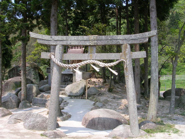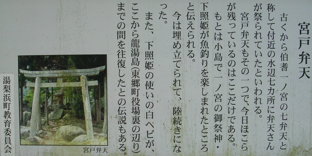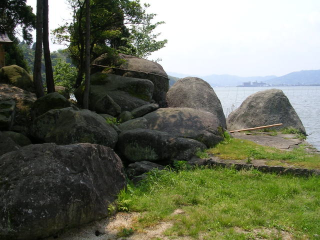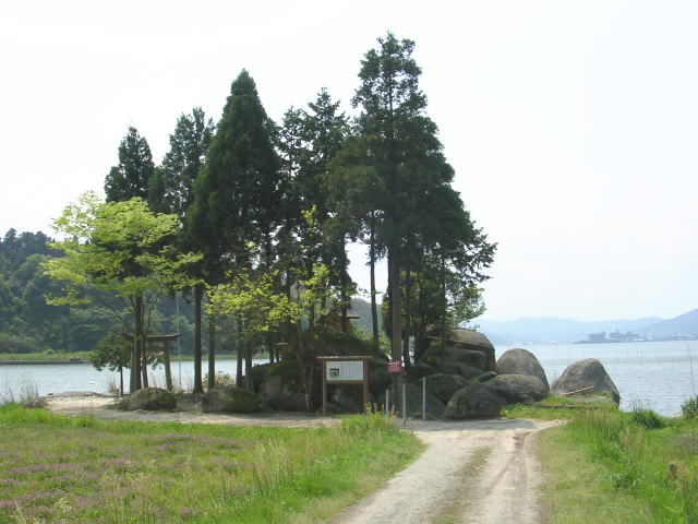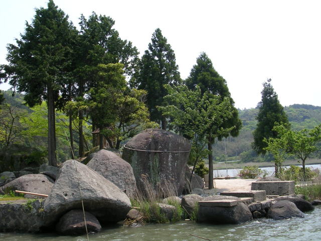 | 鳥取県東伯郡湯梨浜町「県道234号線」沿い (北緯35度29分37秒・東経133度53分53秒(誤差含む))の 「宮戸弁天」・巨岩群(背後は「東郷池」) ▼(北北東より望む) |