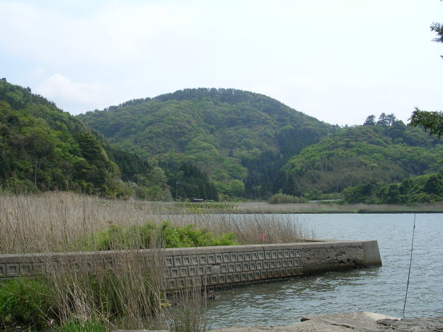 | 「宮戸弁天」鳥居付近より 山麓に「倭文神社」が鎮座する「御冠山(186.3M)」を望む (手前は「東郷池」) ▼(西北西より望む) |