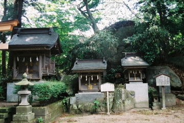 末社「祖霊社」・「多賀神社」・「諏訪神社」 (向かって左より)及び巨岩群(向かって右背後)▼ |