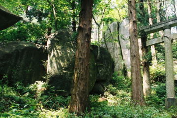 式内社「石都々古和気神社」境内へ 向かう参道脇の巨岩群▼ |