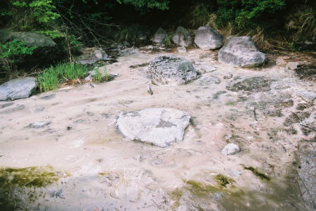 ▼「鍋山の湯」付近の白濁した沢
