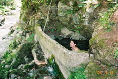 | ▼源泉浴槽脇の「水神」?の石碑 | 「名目津鉱泉跡」源泉浴槽に入湯 「鉱泉」だけに冷たいです。▼ |