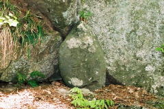 | 「名目津鉱泉跡」源泉浴槽入口(名前の消えた木製プレートあり) ▼中央の「大木の下の巨岩の裂け目」より源泉が湧出しています。 |