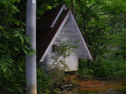 小屋の外へ源泉が漏れ出す「S温泉露天風呂」源泉小屋