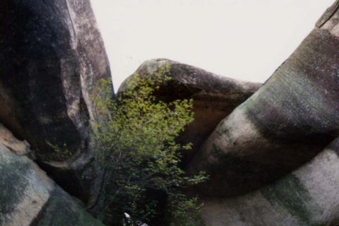 「鬼の岩屋(差し上げ岩)」下部の祠より上部を見上げる