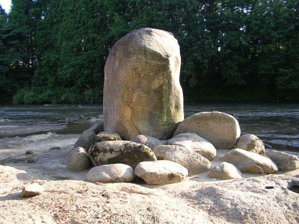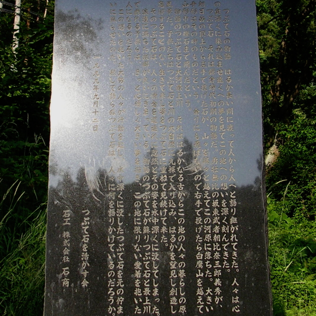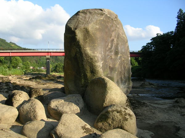 | 山形県西置賜郡白鷹町「国道287号線」沿いの「黒滝橋」北北西 (北緯38度12分18秒・東経140度06分06秒(誤差含む))に存在する「つぶて石」 (北東より望む) |