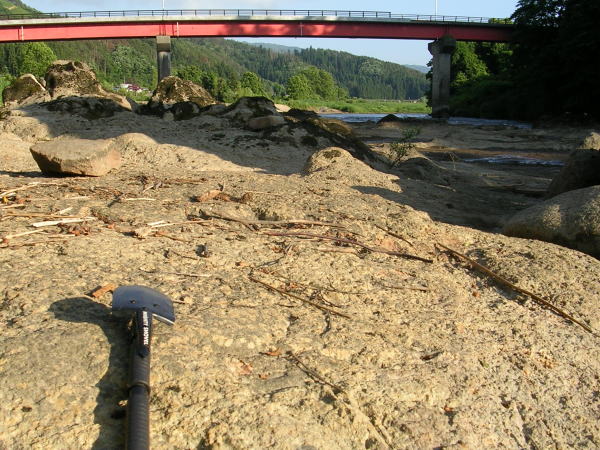 | 「つぶて石」の存在する「最上川」の河原の地層と「黒滝橋」(背後) (北北西より望む) |
