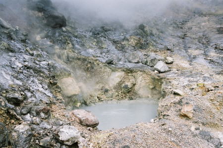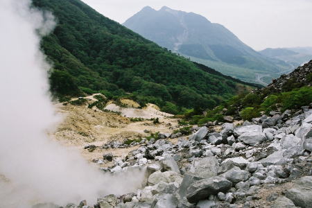 「塚原温泉上の湯」の噴気地帯より由布岳(1582M)を望む