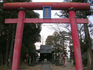 | 群馬県伊勢崎市境米岡149 「米岡神社」境内入口より社殿を望む ▼(南より望む)(03・21) |