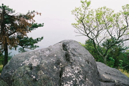 | 巨岩B(北方向より南方向を望む) 巨岩Bの中心部の裂け目?の延長線上に霧島火山群の最高峰である 韓国岳(1700M)を望む事が出来ました。(映像では不鮮明) |
