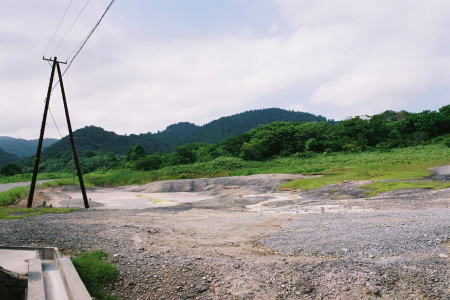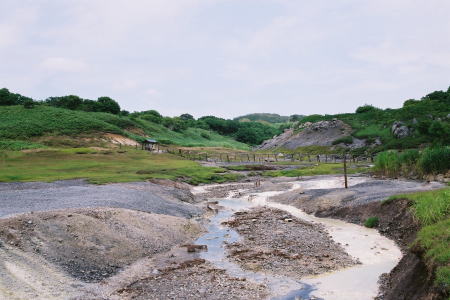 湯坂温泉「地獄釜」より「湯坂温泉石楠花荘」源泉を望む